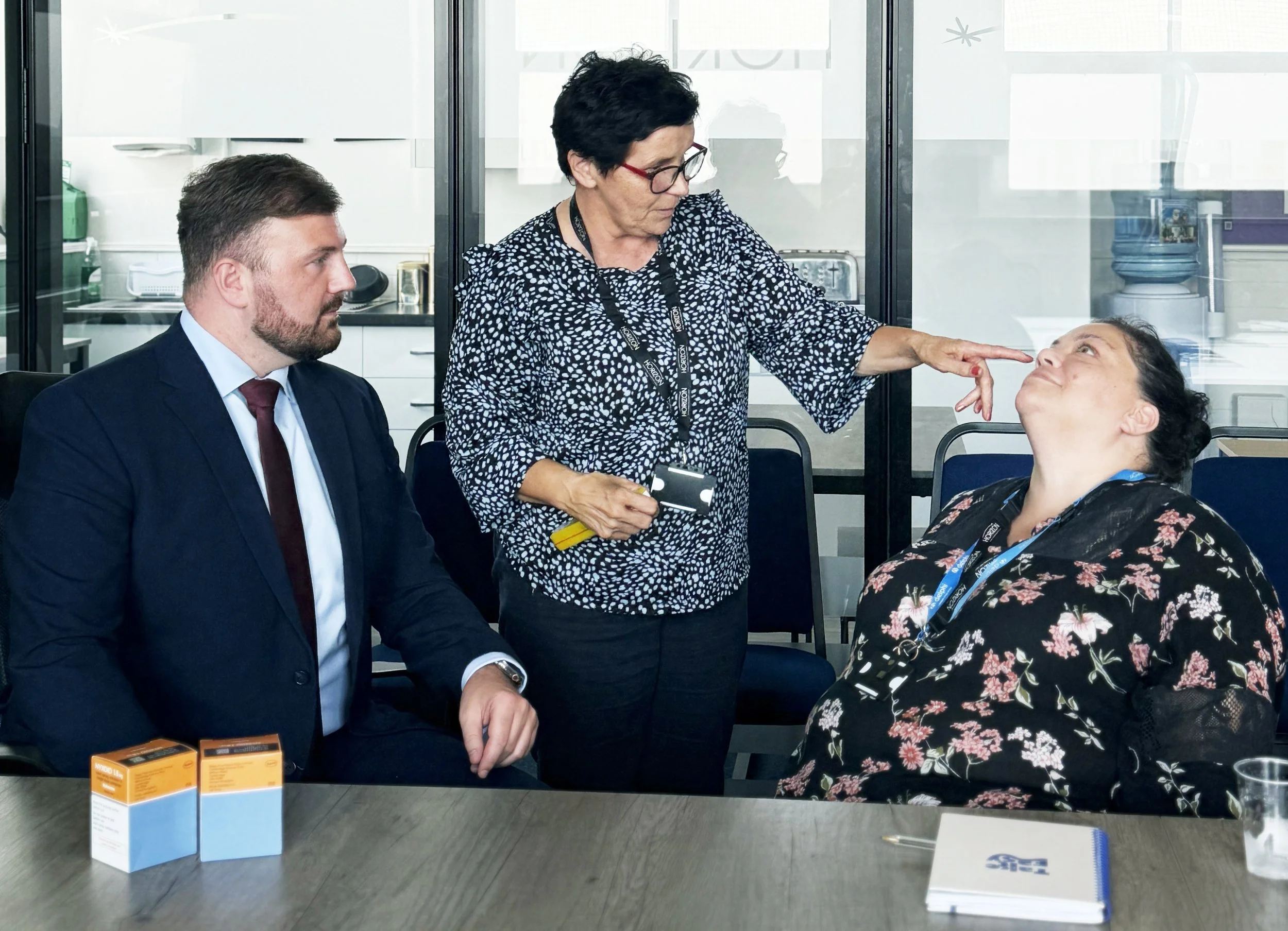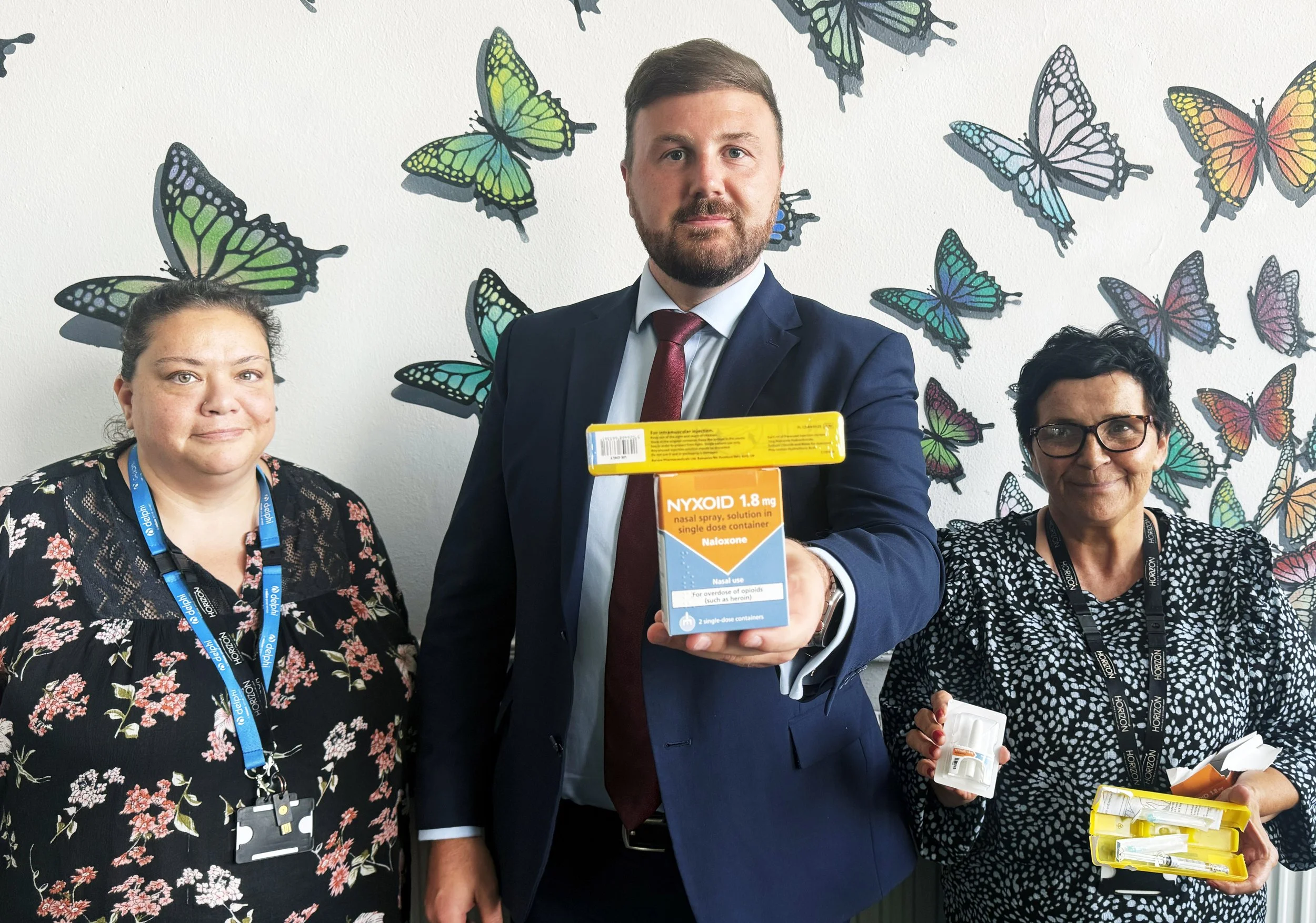 With Gemma Mukadam (left) and Joanne Worrell (right) from drug and alcohol support service, Horizon, who trained the MP in administering a lifesaving drug for opioid overdose last week.
