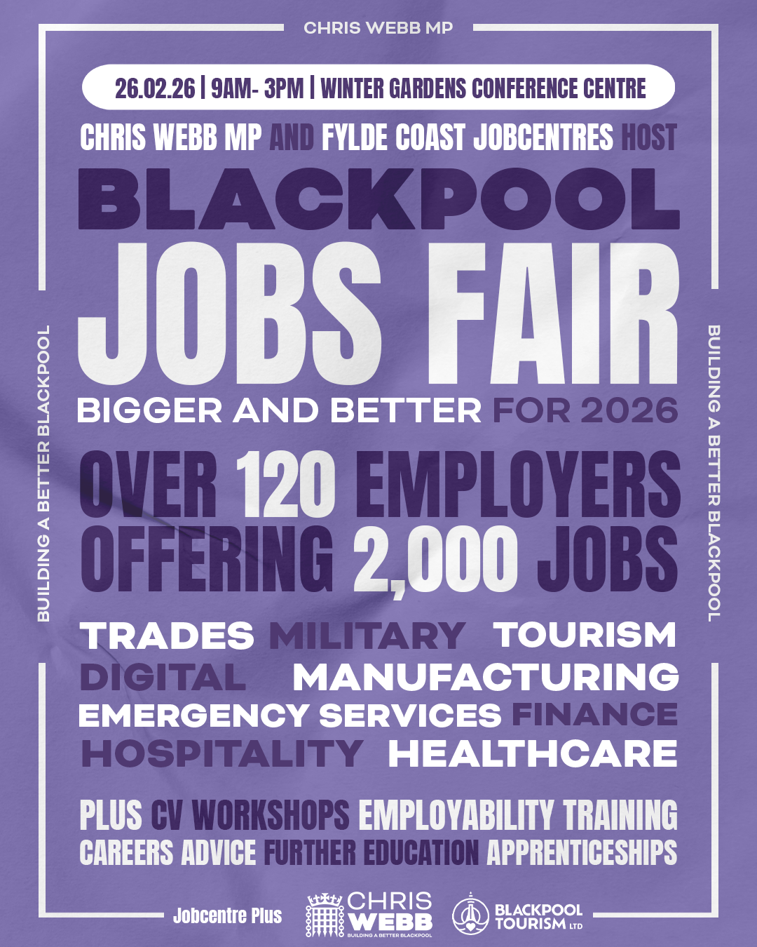 After months of hard work and preparation from my team and local Jobscentre staff, Blackpool Jobs Fair – the biggest the town has ever seen – returns to the Winter Gardens Conference Centre on Thursday 26 February 2026.